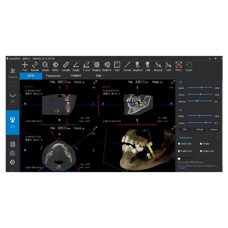 El hueso y la masa ósea en el área del implante se evaluarán mediante imágenes dentales 3D utilizando HiRes3D. El tubo neural se resaltará automáticamente, presentando la relación entre el implante y el tubo neural. Esta es una mejor manera de afrontar una cirugía de implante con éxito.